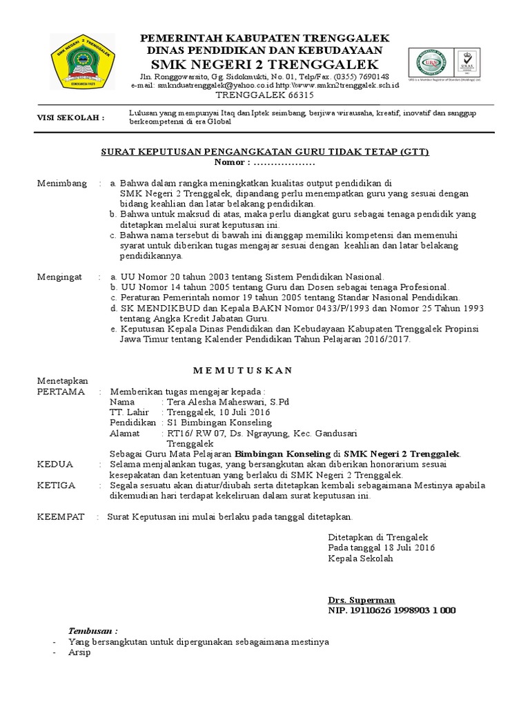 Download format sk pengangkatan guru honorer (gtt) tahun pelajaran 2019/2020 ini saya bagikan dalam berntuk word (.doc).