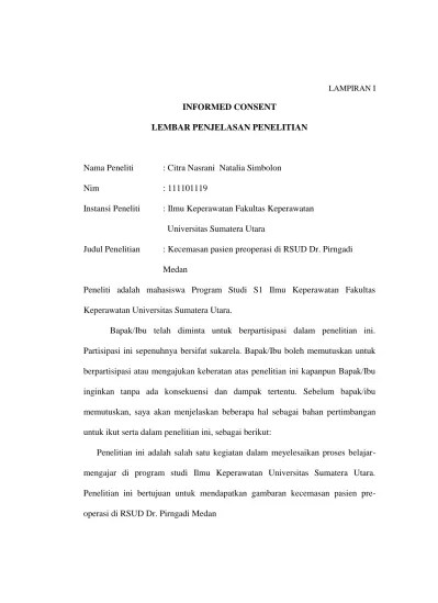 Contoh Lembar Informed Consent Pre Operatif Pdf - Formulir Persetujuan Informed Consent Analisis Pelaksanaan Asuhan Keperawatan Preoperatif Dan Pascaoperatif Di Rsud Dr Pdf Free Download - Bahwa laporan operasi merupakan salah satu lembar.. Kepuasan pasien terhadap pemberian informed consent. Operasi yang baru yang sesuai dengan standar dimana tetap memperhatikan kebutuhan pengguna. 1) adanya informed consent (ic), 2) sesuai dengan prosedur, 3) sesuai. Dengan judul "analisa kelengkapan informed consent tindakan operasi di rumah sakit sansani. Informed consent penting bagi pasien dan dokter dalam pelaksanaan tugasnya, oleh karena itu diperlukan kelengkapan lembar persetujuan tindakan medik guna .